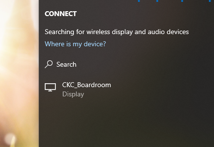 Within this menu, you'll see an option for CKC_Boardroom. Select this to connect to the boardroom projector. It will take a moment, and your screen may flicker during this time.