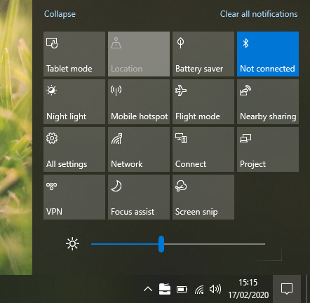 - Open the Action Centre. It can be found at the bottom right-hand corner of the screen, represented by a speech balloon icon.