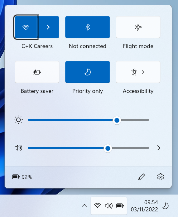 - Open the Control Centre. This can be found by clicking the Wi-Fi, battery, or volume icons at the bottom-right of the screen. You will see the following menu.