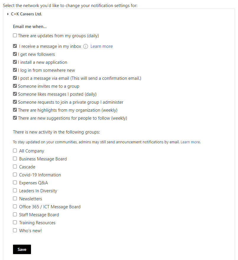 You will be shown a menu of all the email notifications within Yammer. You can use this to tailor your experience.